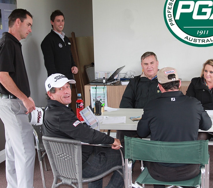 Andrew Crumpton from Dunheved Golf Club in NSW, Titleist Staff Professional Andy Mowatt and Titleist Golf Ball Loyalist Lucien Tinkler completing formalities in the scorers hut.