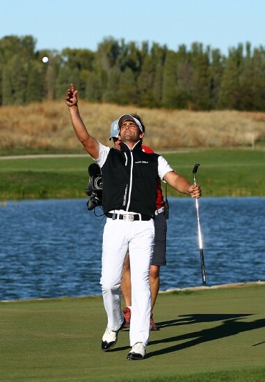 Celebrating - a lucky spectator gets Lee's winning Titleist Pro V1x.