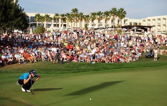 Lewis lines up his putt on 18 in front of a big audience.