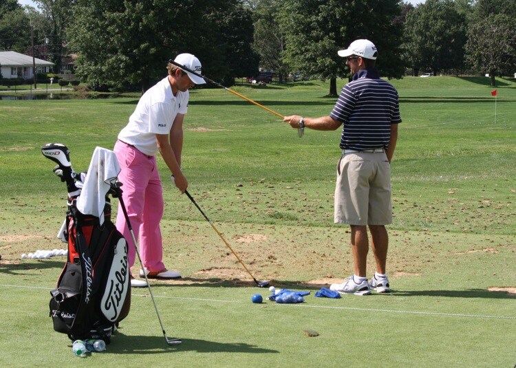 Webb Simpson, fresh off his first career win last weekend, puts in some drill time with his caddie.