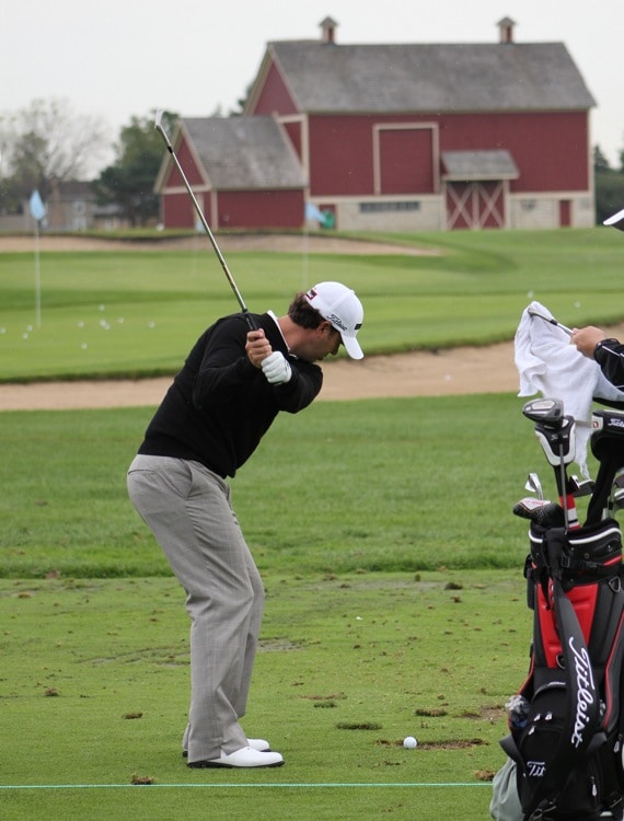 Also warming up: Titleist Brand Ambassador Scott Piercy, with Cog Hill's famous red barn lurking at the back of the driving range.
