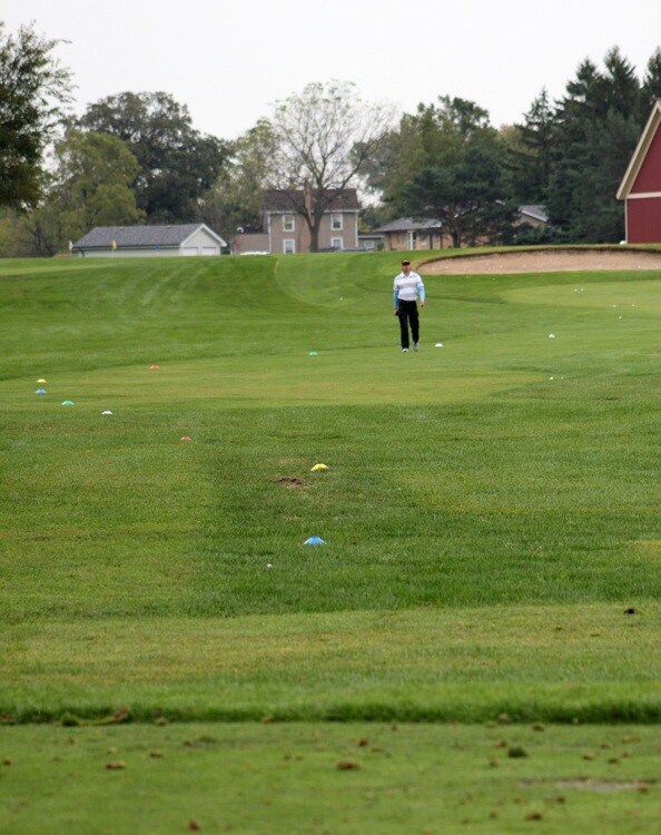 That's not him. It's his caddie, setting up some distance markers for a range session.
