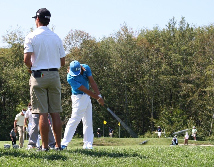 On the other end of the range, Titleist Brand Ambassador Rickie Fowler lets one rip with his Titleist 910 driver.