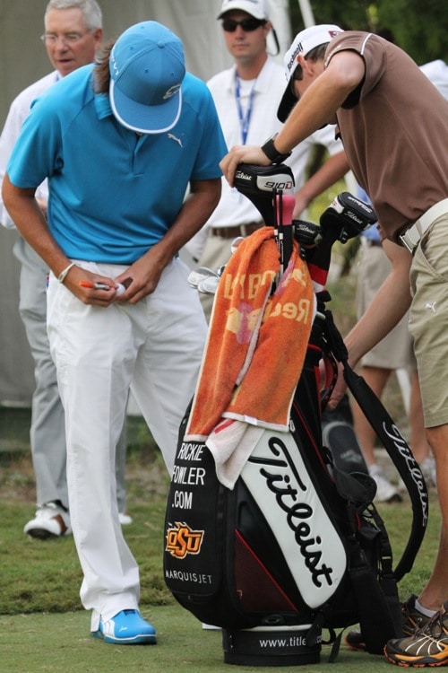 Rickie marks his Titleist Pro V1x golf ball – with an orange marker, of course.