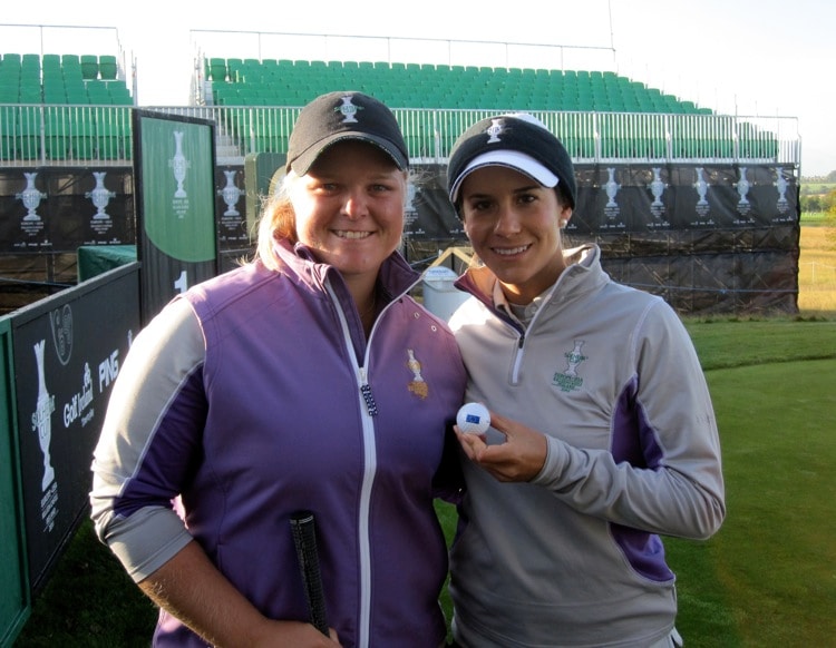 Pro V1 loyalists Caroline Hedwall (left) and Azahara Munoz show off their Pro V1s featuring the flag of the European Union.