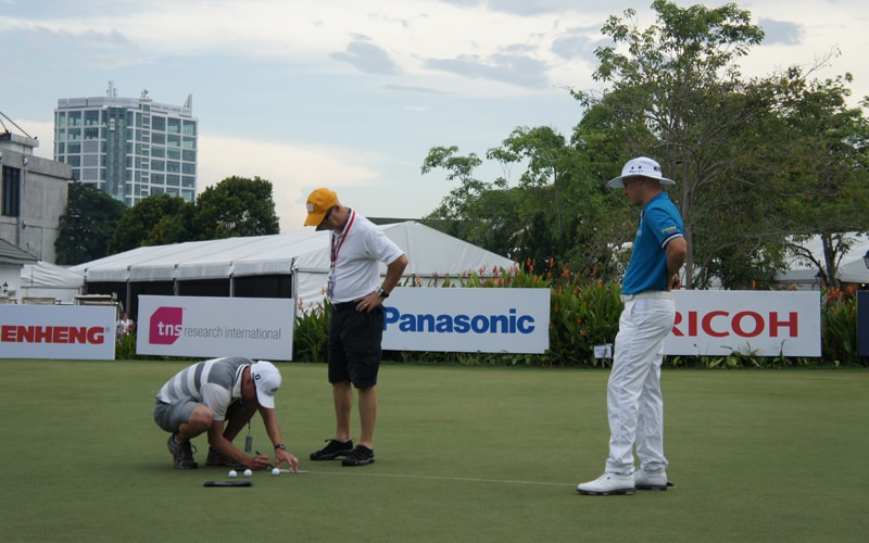 using a putting aid on the practice green at the CIMB Classic. They spent a lot of time on the putting green with Ben trying to get used to how grainy the Malaysian greens are. He thinks this will be one of the biggest differences between playing in the US and Malaysia this week, and as such is making sure he is as prepared as possible for them.
